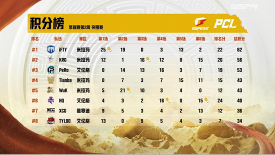 周中赛排在第十三名的iFTY战队为了拿到周决赛的入场券,队内双子星LongSkr选手和Monsters选手齐心协力,分别以35.3%和26.8%的得分贡献率将队伍送上本周突围赛榜首;KRG战队稳扎稳打,牢牢把握住每一局的得分机会,队内Bcup选手更是以高达2236的伤害值入围战神榜前三,帮助队伍拿到56分排在第二;PeRo战队虽在周中赛排在倒数第三的位置,但来到突围赛, Aixleft选手发挥神勇,以11个淘汰数帮助队伍拿到53分位居第三;此外TYLOO战队以微弱的3分优势踩线晋级周决赛,同时上周黑马DDT战队和GFY战队在本周无缘晋级周决赛。