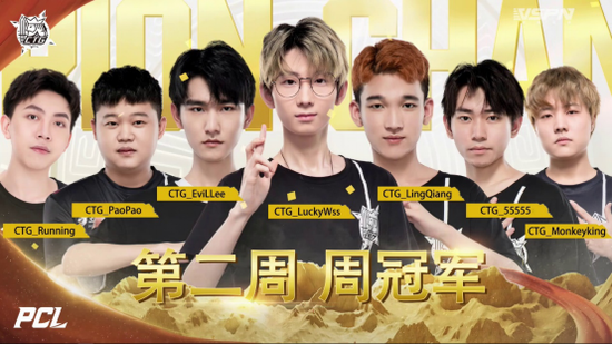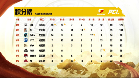 周决赛首日第一局,面对八阶段仅存的四支队伍,CTG战队占据高处优势,先手淘汰WUK战队,随后在缩圈阶段加入Tianba战队和PeRo战队的混战,CTG战队以人数优势成功淘汰Tianba战队独狼吃鸡;第二日第七局七阶段,TYLOO战队以满编的优势与CTG战队交火,眼看蓝圈收缩,CTG战队的PaoPao选手在圈边闪击TYLOO战队并连续击倒几人,CTG战队的队员抓住机会集体前压淘汰TYLOO战队成功吃鸡!紧接第八局最后阶段,CTG战队先手淘汰DT战队后与iFTY战队solo,PaoPao选手在关键时刻再一次站了出来,通过不断走位拉开枪线,CTG战队成功淘汰iFTY战队,再下一鸡!最终CTG战队以总分123分拿下本周周冠军。
