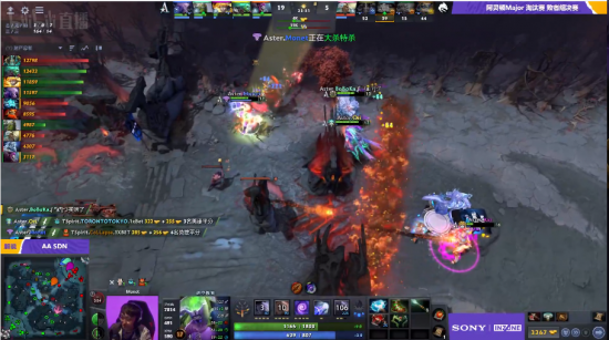 8分钟大锤开大游走到下路将玛尔斯击杀,对线期结束,Aster死亡先知大锤双核经济领跑。