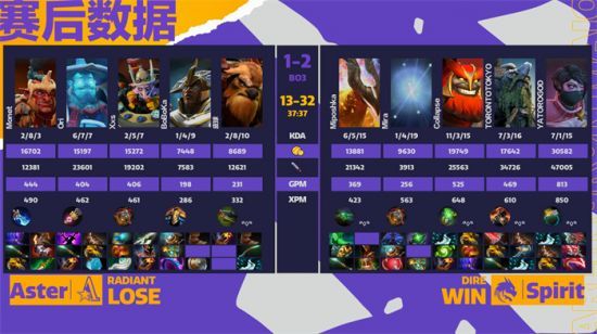 第一局Aster点出一号位钢背,前期获得优势成功控盾,但是控盾后两波团战连续打亏反而让Spirit掌握了局势,Spirit核心装备成型后Aster阵容厚度不够打,败下阵来,Spirit赢下第一局。