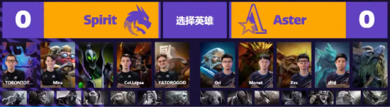 Aster在天辉,Spirit在夜魇。选人分路:上路是Xxs的大锤和Boboka的小小对阵Yatoro的剑圣和Miposhka的陈。中路是Ori的死亡先知对阵TORONTOTOKYO的蓝猫。下路是Monet的虚空和皮球的戴泽对阵Collapse的玛尔斯和Mira的宙斯。