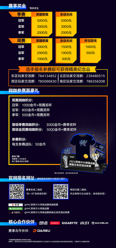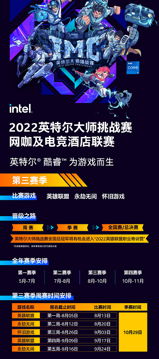 战火燃燃,登场皆英雄,2022英特尔大师挑战赛网咖及电竞酒店联赛第三季即将打响,期望身手不凡的你能够当仁不让,在第三季的赛场中一展英姿,丰厚的奖金奖励和青训营资格将是你最好的战利品,欢迎各战队踊跃报名,以不凡实力书写英杰之诗。