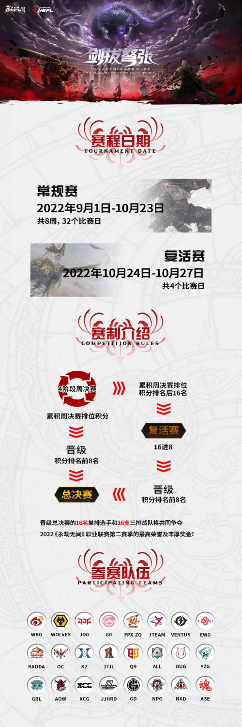 2022《永劫无间》职业联赛第二赛季即将开启,24名单排选手和24支三排战队在这里共同争夺冠军的荣誉以及260W的丰厚的奖金!