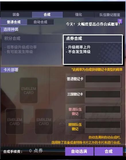 活动规则:活动期间内,使用点券合成徽记卡成功率提升。活动期间内,合成徽记卡费用降低。