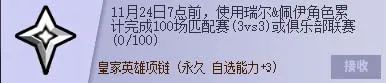 活动规则:活动以角色为单位进行。拥有多个瑞尔&佩伊时,任务独立进行。活动期间内,新创建的稀有角色瑞尔&佩伊才会显示和完成该任务。完成100场比赛可以获得道具:皇家英雄项链(上身装饰,永久,自选能力+3)比赛:正常结算的匹配赛3V3、俱乐部联赛。奖励发放至角色礼物盒。礼物盒有效期为30天。瑞尔&佩伊若使用变更卡,将无法佩戴专用装饰。