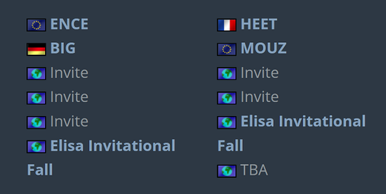 2022 埃斯波Elisa大师赛共计12支参赛队伍。除了MOUZ之外,已经有三支队伍确认参赛。分别是主办方直邀的ENCE、BIG和7月初通过次级联赛晋级的HEET战队。目前主办方手中还剩下五个邀请名额,而剩下的最后三个参赛名额将同样通过次级联赛产生。目前2022 Elisa秋季邀请赛已经如火如荼的打响。BNE和MASONIC战队目前都是3-0的战绩。
