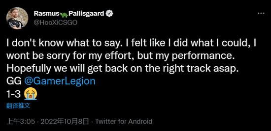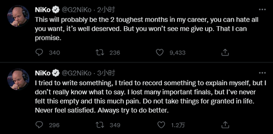 在这场令人心碎的溃败之后,G2队员在个人的社交平台上发表了自己的看法。NiKo连发两条推特:1.我试着写点什么,记录点什么来自我剖析。但我发现不知道该说什么。我输掉过许多重要的决赛,但我从来没有感觉到如此的空虚和难受...不要把生活中的某些事情视为理所当然,永不满足,永远努力做到更好。2.这可能是我职业生涯最艰难的两个月,你可以尽情的黑,这是我们应得的。但我保证,我绝对不会放弃!