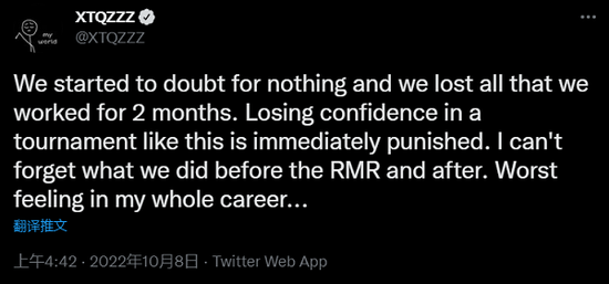 战队教练XTQZZZ指出缺乏信心是战队的主要问题:我们开始无缘无故的怀疑,结果就是过去两个月做所得一切都一瞬成空。在这样的比赛中失去信心之后,立刻就会收到“罚单”。我无法忘记我们在RMR前后的努力。这是职业生涯中最糟的感觉。