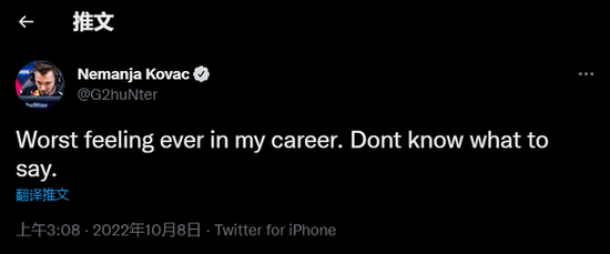 他的队友和堂兄huNter也在个人推特上表示:打职业以来最糟糕的感觉,不知道该说什么。