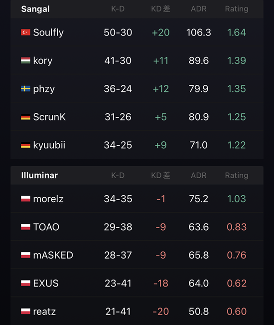 两边的对决图一来到Ancient,Illuminar看开局赢下手枪局获得4-0的领先,但是再次来到长枪局Soulfly开始发力,在他的带领下Sangal打穿了Illuminar的中路防线,半场取得10-5的领先。来到下半场,Illuminar虽然有凭借刚枪翻盘连续追分过,但是Soulfly的首杀还是让Sangal顺利拿下图一。
