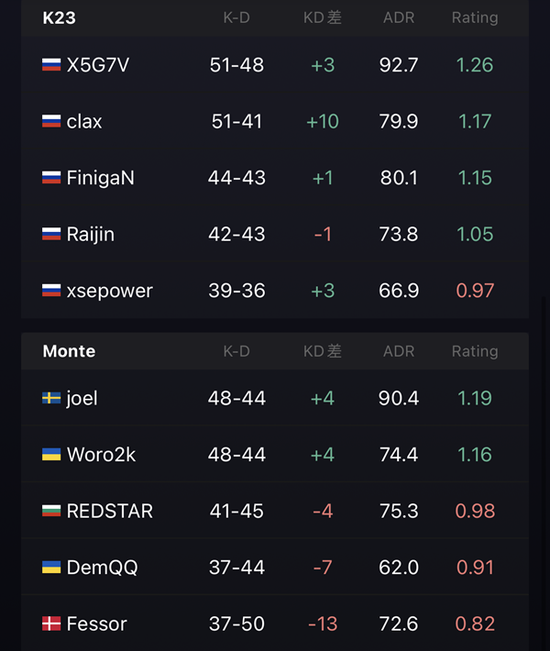 CIS地区强兵K23今日遭遇国际纵队Monte。图一Mirage上,Monte在上半场打出出色的抱团进攻,xsepower手感欠佳频频被对手破点。半场结束,Monte 9-6领先。来到下半场,K23通过手枪局的获胜重新扳回了局势,随后两边互有来回,比赛一路打进加时。更加稳健的K23在clax的带领下最终艰难拿下图一。