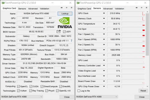 首先是检测软件GPU-Z可看到影驰 GeForce RTX 4090 金属大师 OC 的产品规格和基本参数,以及其待机温度为34.0°C,功耗为11.8W。