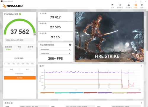其次进行的是 3D Mark Fire Strike DX11测试,影驰 GeForce RTX 4090 金属大师 OC 显卡分数达到了73417 分。这项极高的分数也告诉了玩家们,影驰 GeForce RTX 4090 金属大师 OC 在4K分辨率下也可以让玩家们流畅的享受市面上的所有游戏。其中包括光追游戏和VR游戏,影驰 GeForce RTX 4090 金属大师 OC也能为满足玩家们高刷新率的需求。