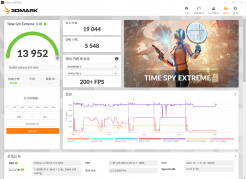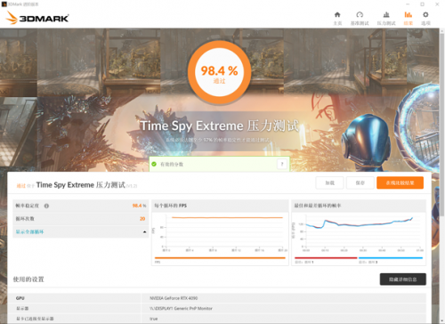 3D Mark压力测试即检测在连续跑分的情况下显卡性能是否会发生下降,以往的分数线一直在97%以上才能算作是合格分数。影驰 GeForce RTX 4090 金属大师 OC 也在这项测试下取得了98.4%的好成绩,可以算是非常稳定的通过了检测。