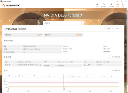接下来让我们用测试来向玩家们提供最直观的数据,本次测试采用的是最新版的3D Mark中所新增适配的DLSS 3的BenchMark,测试提供了4K和8K两个分辨率的结果。结果中可以看到,在4K分辨率下打开NVIDIA DLSS 3技术,影驰 GeForce RTX 4090 金属大师 OC 显卡帧数可以达到165帧,这个数值是不开启NVIDIA DLSS 3技术的三倍之多。再看8K分辨率下的数值,拥有DLSS 3技术的加持下,影驰 GeForce RTX 4090 金属大师 OC 显卡帧数也可以达到91的帧数。
