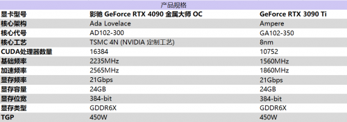 首先来看一下影驰 GeForce RTX 4090 金属大师 OC与GeForce RTX 3090 Ti规格参数对比: