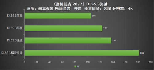 如果不开启NVIDIA DLSS技术,《赛博朋克 2077》在4k分辨率下仅仅能跑到72帧的成绩。虽然帧数不高,但是也足以让玩家们流畅游戏。但是对于追求极致游戏体验的玩家而言,NVIDIA DLSS 3技术的加持,让性能有了质的飞跃。凭借着影驰 GeForce RTX 4090 金属大师 OC强大的性能,即便是在4k分辨率下,搭配NVIDIA DLSS 3技术,《赛博朋克 2077》最高依旧能跑出180帧以上的成绩。将近60%的数据提升,毋庸置疑,NVIDIA DLSS 3 技术的强大是显而易见的。当然了,玩家们如果没有追求极致的画质的话,也可以选择DLSS 2超级性能模式,打开该模式后,帧数也会近39%的性能提升。