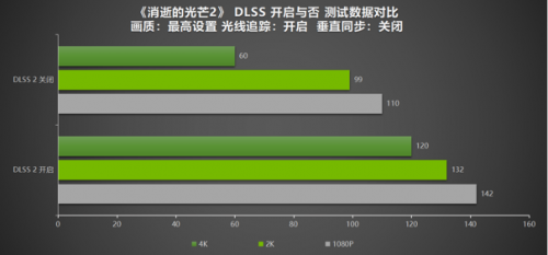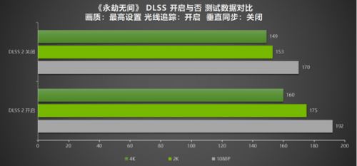 作为一款优化良好的国产游戏,《永劫无间》NVIDIA DLSS技术开启前后的帧数变化相差相对稳定。经过NVIDIA DLSS技术的优化后,1080p分辨率下的帧数达到了将近200;2k分辨率下的数值也能高达175;即便是在4k这样的超高分辨率下,也达到了160这样让人精细的帧率。NVIDIA DLSS技术的加持让玩家们得到了超高超流畅的游戏体验。