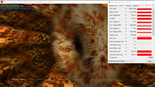 上图中所呈现的是FurMark测试中影驰 GeForce RTX 4090 金属大师 OC GPU的功耗控制能力。开启FurMark后,等待温度与功耗数据稳定,最终所获得的结果是GPU的功耗为446.5W,温度为69.5℃。在满载功耗的情况下,影驰 GeForce RTX 4090 金属大师 OC 的温度依旧能保持在一个稳定的情况,可想而知其散热性能的优良发挥。以及其满载时所需要的功耗达到446.5W,这里建议各位玩家和设计师们电源上的选择是使用功率为850W以上的电源设备。