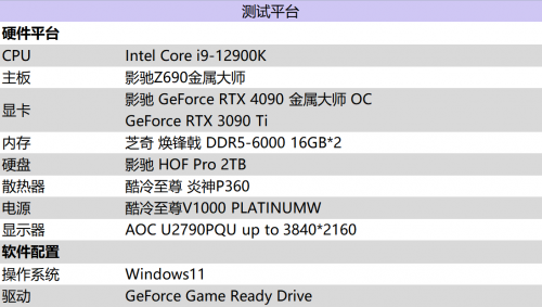 正式进入测试环节,本次测试平台处理器采用Intel Core i9-12900k,搭配影驰Z690金属大师主板,内存采用芝奇幻锋戟 DDR5 6000Hz 16GB*2;固态采用的是 影驰 Hof Pro 2TB。PCIe4.0 固态的超高读写速度 搭配超高性能的配置让影驰 GeForce RTX 4090 金属大师 OC出彩的性能在测试中完美呈现出来。