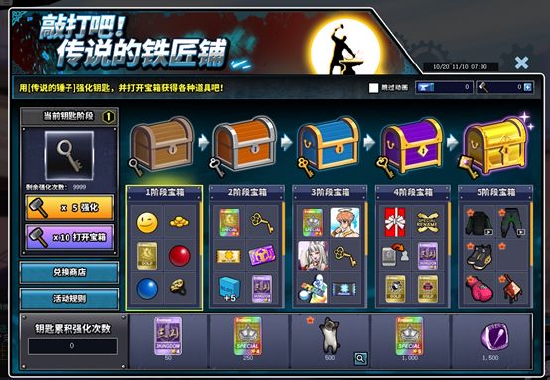 10月20日服务器维护后~11月10日7点,玩家可以用传说的锤子[强化]钥匙并且可以打开对应阶段的宝箱。[强化]钥匙和打开宝箱所需的传说的锤子数量根据当前钥匙阶段来决定。钥匙分为1~5阶段,5阶段是最高阶段!