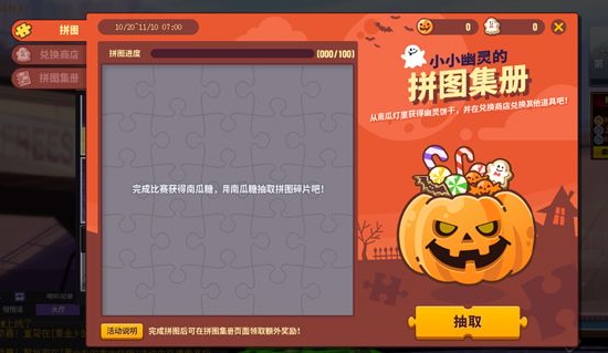 10月20日服务器维护后~11月10日7点,完成比赛后获得南瓜糖,用南瓜糖抽取拼图碎片吧!(每日上限15个)