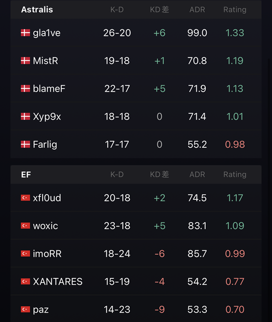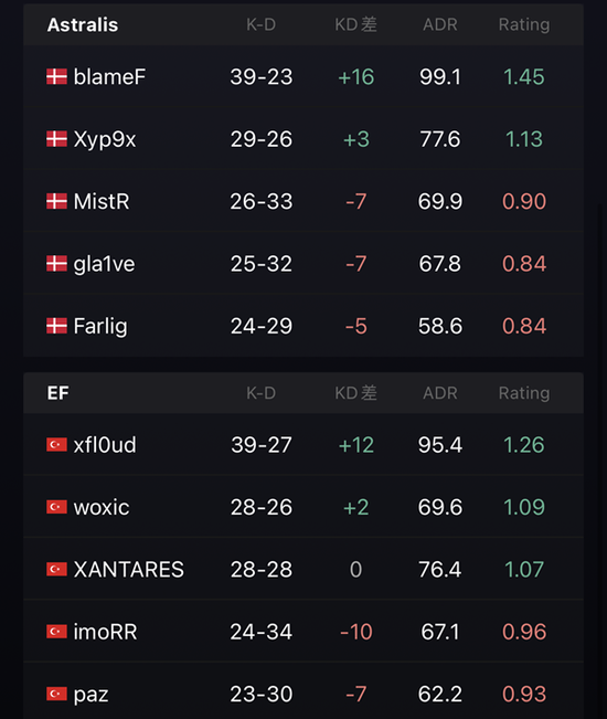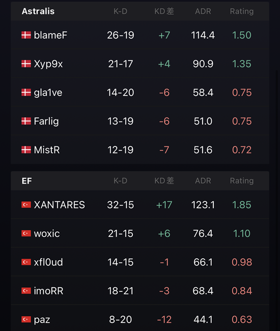 BLAST Premier 2022秋季复活赛 欧洲区,Astralis对阵EF,图一Dust2中A队开局处于落后的形势,凭借十足的韧劲和耐心的战术展开,成功翻盘,以16-14战胜EF先下一城。图二Overpass中,XANTARES多次完成关键突破和残局,1.85 rating的神级发挥帮助EF扳回一局。图三NUKE,先做防守方的Astralis稳扎稳打拿到11分,下半场凭借上半场积累起的手感不断扩大比分,EF也不甘示弱,顽强的将比赛拖入加时,最终A队更胜一筹,2-1战胜EF。