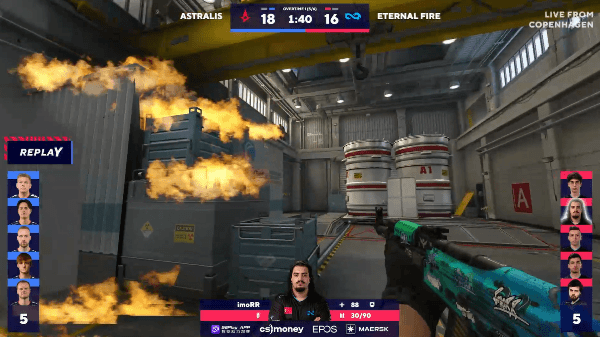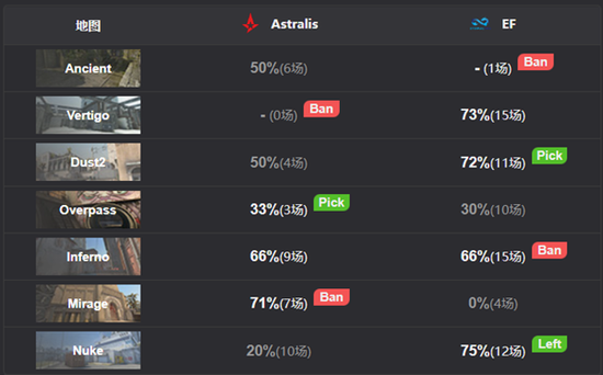 进入Astralis的自选图Overpass,A队选择长管一波提速,遇到EF重防B区,EF取得开门红赢下手枪局。EF凭借稳扎稳打和残局的精妙处理,将比分扩大为5-0。