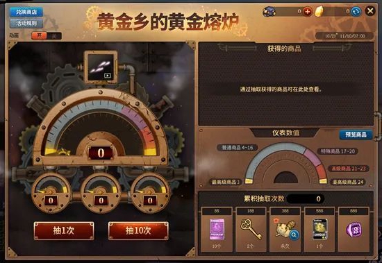 每次抽取时会获得精炼黄水晶,用精炼黄水晶可在兑换商店兑换各种商品。