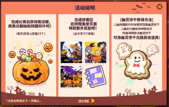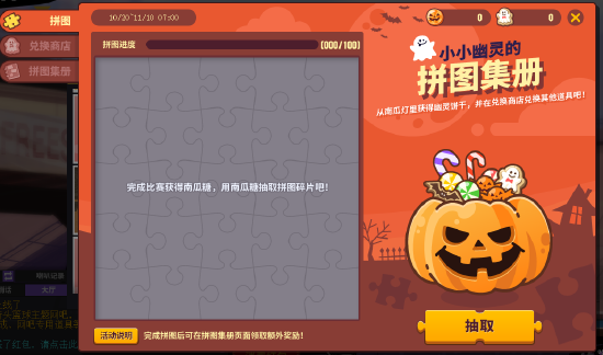 完成比赛后获得南瓜糖,用南瓜糖抽取拼图碎片吧!(每日上限15个)完成拼图后在拼图集册页面领取额外奖励吧!