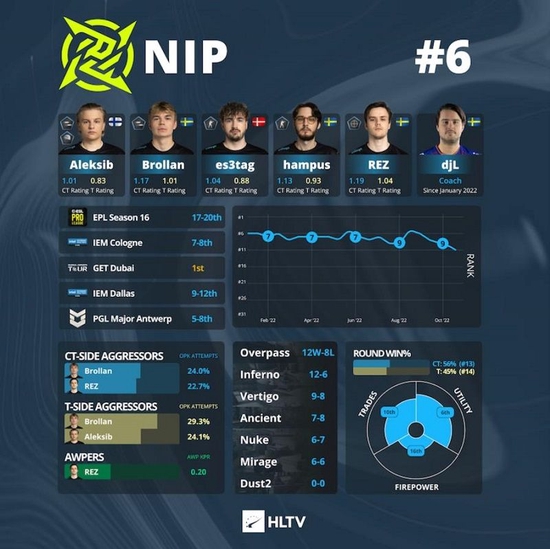 回想CSGO曾经的王者,首先映入海之中的就是Ninjas in Pyjamas俱乐部。在2012年CSGO这款游戏刚发布不久之后,NIP便宣布正式进军该项目。这家瑞典俱乐部在头年就创造了时至今日仍为人津津乐道的87-0连胜纪录。而在此之后Ninjas in Pyjamas俱乐部也一直是CSGO顶级强队中不可忽视的力量。虽然随着时间的推移,Ninjas in Pyjamas捧杯的次数也越来越少,但他们依旧在HLTV Top15战队之中保留有自己的一席之地,这也是Ninjas in Pyjamas稳定的最好体现。