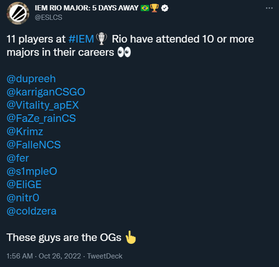 目前有11位选手出席了超过10届Major,他们是dupreeh、karrigan、apEX、rain、KRIMZ、FalleN、fer、s1mple、EliGE、nitr0和coldzera。
