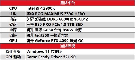 本次测试平台处理器采用Intel酷睿i9-12900K+华硕 ROG MAXIMUS Z690 HERO主板;内存采用 芝奇 幻锋戟 DDR5 6000Hz 16GB*2;耕升 GeForce RTX 4090 炫光 OC 的显卡TDP为450 W,故电源套装采用的是 耕升 星源 G850金牌 850W搭配 耕升 骇浪360 一体式水冷,能最大程度为GPU降温。这套配置足以让耕升 GeForce RTX 4090 炫光 OC能在稳定的环境下最大程度发挥出其超强性能。