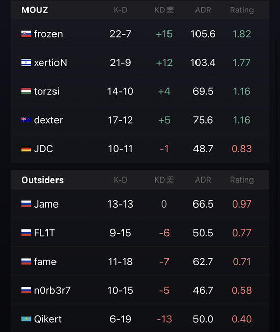来到第一个长枪局,在前期的简单控图之后,土匪选择直接B区爆弹,但优秀的道具管理让xertioN的燃烧弹成功拖死对方进攻,后续补防也让他们毫无压力直接拿下。这之后Jame展示了一如既往的的进攻指挥,Outsiders延续着他们的慢速进攻,极致的压缩进攻时间,而MOUZ的防守体系虽然显得并不优秀,中期的信息收集不太足够,但是dexter仿佛摸透了对方的套路,总能用关键的道具和回防粉碎对方进攻,比分直接来到8-3。