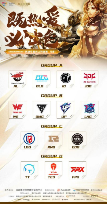 A组:AL、BLG、iG、JDG;B组:WE、OMG、UP、LNG;C组:LGD、RNG、EDG;D组:TT、TES、FPX