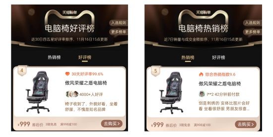 天猫榜单显示,傲风千元级经典款电竞椅——傲风·荣耀之盾系列,高居天猫榜单·电脑椅热销榜Top5。更难能可贵的是,产品口碑也同获用户好评,高居天猫榜单·电脑椅好评榜Top5(数据截至2022年11月16日15:00)。