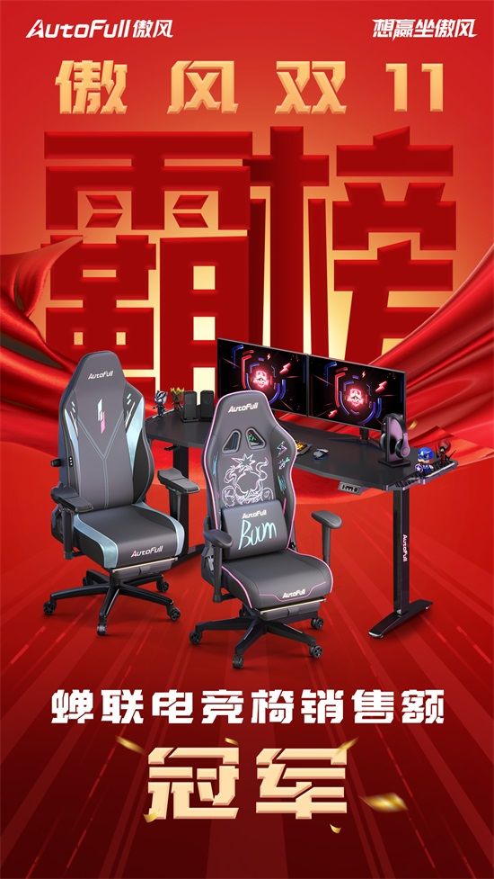 双十一嗨购收官,AutoFull傲风,再度登顶电竞椅销售额榜首,并且销量遥遥领先于其他专业电竞椅品牌。