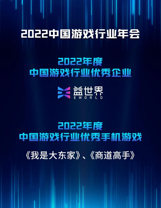 11月17日傍晚,由中国文化娱乐行业协会主办的2022中国游戏行业年会进行了“金手指奖”的颁奖典礼。会上,益世界连续获得多项荣誉。