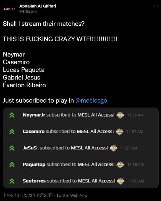 MESL是中东、巴基斯坦、印度地区最大的FACEIT hub(即某种社区)。根据MESL所有者、Twitch合作伙伴Abdallah Al Ghifari所说,巴西国家队队员内马尔(PSG)、热苏斯(阿森纳)、里贝罗(弗拉门戈)、帕奎塔(西汉姆联)、卡塞米罗(曼联)报名加入了他的MESL。