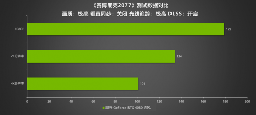 《赛博朋克2077》是首批支持DLSS 3 技术的游戏,同时也是光追效果最好的游戏之一。DLSS 3 所带来的巨幅提升能让玩家们流畅地在夜之城中惩奸除恶。在极高画质光线追踪最高的设置下, DLSS关闭4K分辨率下只能跑到20帧左右,2K也只能跑到51帧,而在1080P下则可以跑到71帧勉勉强强的成绩。而在开启DLSS 3 帧生成模式后,帧数就有明显的提升。4K分辨率下能跑到101帧,2K分辨率跑到134帧,1080P则可以跑到179帧。
