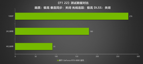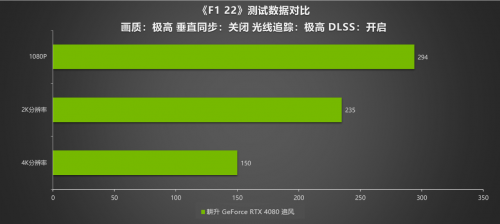 《F1 22》作为同样首批支持DLSS 3游戏,DLSS给该游戏带来的性能提升十分显著。在极高画质光线追踪开启4K分辨率下,游戏依然能保持91帧,2K分辨率下能跑到180帧,1080P下更是能跑到276帧。更新显卡驱动后在游戏中开启DLSS 3 帧生成模式,4K分辨率下能跑到150帧,2K分辨率下能跑到235帧,1080P下更是能跑到294帧,游戏过程中流畅运行无卡顿无闪退现象等出现。