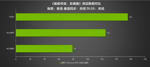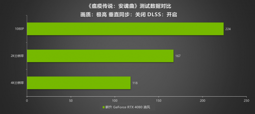 《瘟疫传说:安魂曲》游戏中自带光线追踪效果,同时也是首批支持DLSS 3 技术的游戏之一。在极高画质4K分辨率下,游戏帧数为79帧,2K分辨率下为125帧,1080P下为156帧。在开启DLSS 3 帧生成模式后,游戏性能获得大幅提升,4K分辨率下可以跑到118帧,2K分辨率可以跑到167帧,1080P更是可以跑到224帧。对于剧情类冒险游戏来说,这个帧数可以让玩家完美运行该游戏。