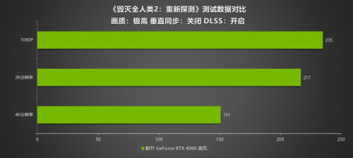 最后一款测试的游戏就是《毁灭全人类2:重新探测》,游戏在上线时即支持DLSS 3 技术。在这款游戏中,DLSS 3 的提升十分显赫,在极高画质 DLSS 关闭 4K分辨率下,游戏只有79帧的成绩,2K分辨率下能跑到99帧,1080P能跑到110帧。而在极高画质DLSS 3 开启的情况下,4K分辨率下则是能跑到151帧,2K分辨率下则是能跑到217帧,1080P下也能跑到235帧。可见开启DLSS 3技术后,能为游戏带来至少2倍的性能提升。