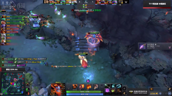 9分钟,蝙蝠和海民在中路将祸乱之源影魔再度击杀。10分钟,下路小小和虚空被海民死亡先知绕后击杀, 随后伐木机又被飞鞋蝙蝠拉住,RNG再推掉下路一塔。