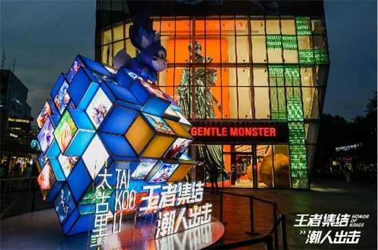 位于三里屯太古里南区主入口处的「英雄集结站」是整个主题展的起点,大型光影艺术魔方装置流光溢彩。恰逢太古地产50周年,魔方上设置50个LED屏幕轮播动态视频,展现三里屯太古里的潮流瞬间,也集结王者荣耀50位英雄与50个皮肤,影像变换,潮流不息。
