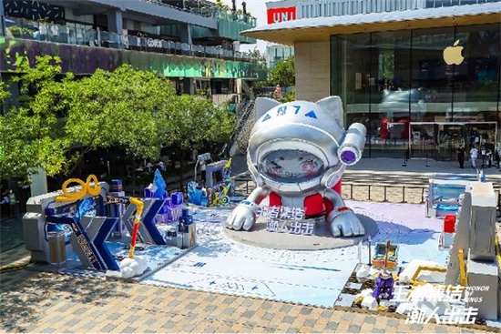 本次主题展的主装置区,则是位于南庭的「峡谷引力场」。其正中央的是王者荣耀高人气英雄「鲁班七号」巨型多媒体艺术装置。在白天是街区的C位潮咖,夜晚是灯光秀的酷炫DJ,全新的趣味互动形态释放无限潮力。同时,展区内还设置了高能互动「五杀挑战」,将王者峡谷中的五杀对决,转换为五重潮流竞技场景,潮人与英雄互动PK,连续性挑战闯关,即可获得神秘惊喜限量好礼!