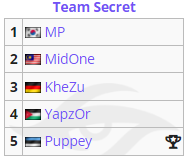 所以说,Secret的队史也可以说是Puppey的后半段职业生涯全部缩影。Puppey在Secret一代目中可谓是下足了心思,请来了同为NAVI战队的KuroKy、TI3冠军Alliance的s4、Fnatic的Fly和同在Fnatic名不见经传的N0tail。