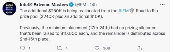 ESL正式宣布,即将举行的IEM 里约 Major总奖金池将增加至125万美元。增长的25万美元中,24万是此前各地区RMR阶段的奖金,ESL再添了1万美元。