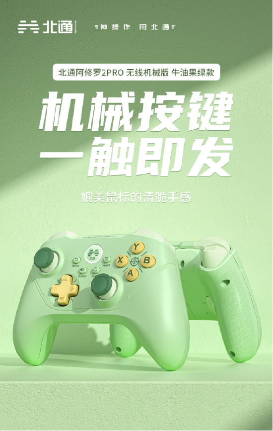 而在游戏手柄玩家圈中,喜欢机械按键,又偏爱北通阿修罗2Pro的玩家们有福了:北通阿修罗2Pro无线机械版牛油果绿款全新上线,本次的新品从按键、十字键、扳机和外观四方面四重突Pro升级,为玩家们打造性能全面的电竞游戏手柄。