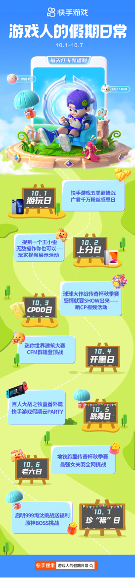 心心念念的十一长假将至,游戏人用什么方式愉悦自己?假期计划不好搞,快手游戏来支招——为了带给大家更美好的假期生活,快手游戏推出“游戏人的假期日常”活动,向全网游戏玩家吹响快乐集结号。即日起至10月7日,多个不同主题日将花式送福利、快乐玩直播,相信热爱游戏的你会玩得不亦乐乎!